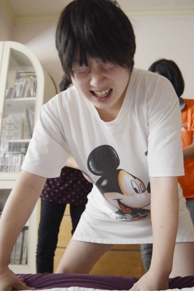 助產士按摩腰背處,紹文用蹲距搖擺的姿勢舒緩產痛。圖片提供/蕭立峻、蔣紹文
